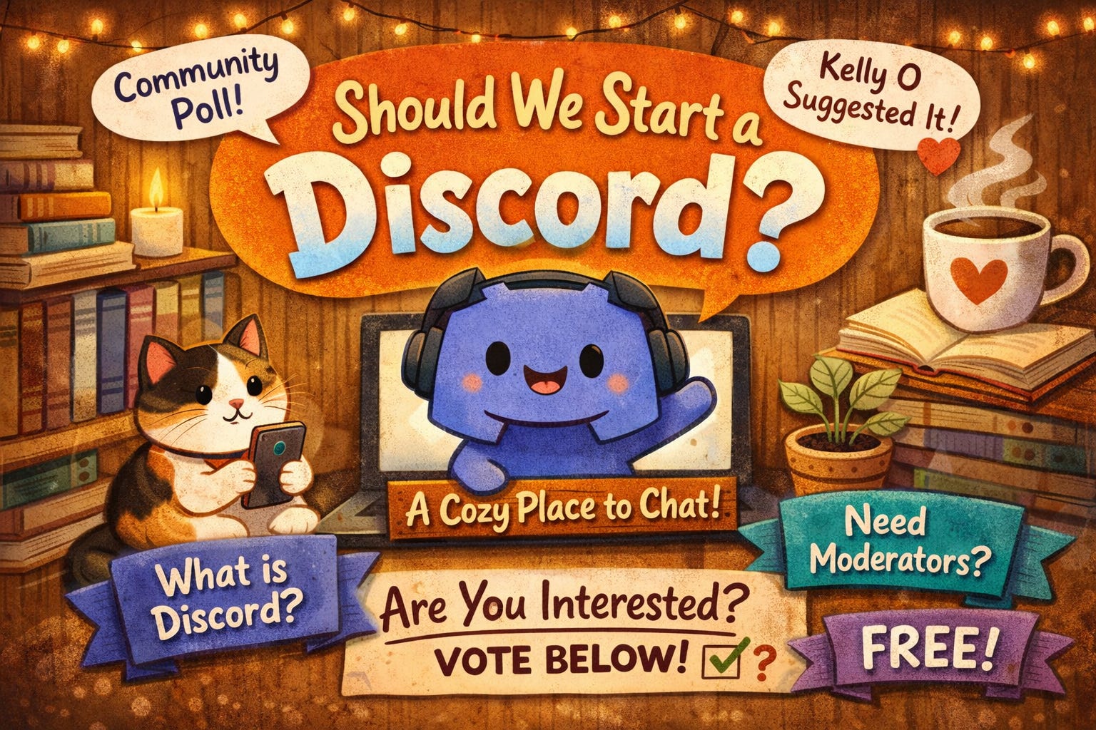 This would not be a paid thing or a new tier. Just a free community space for anyone who wants to hang out, chat, and be cozy together.
